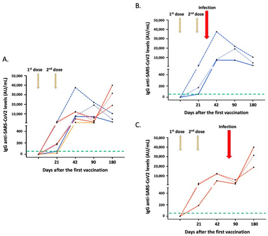 - Danese, E.; Montagnana, M.; Salvagno, G.L.; Peserico, D.; Pighi, L.; De Nitto, S.; Henry, B.M.; Porru, S.; Lippi, G. Comprehensive Assessment of Humoral Response after Pfizer BNT162b2 MRNA Covid-19 Vaccination: A Three-Case Series. Clin. Chem. Lab. Med. 2021, 59, 1585–1591. [Google Scholar] [CrossRef] [PubMed]