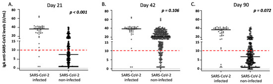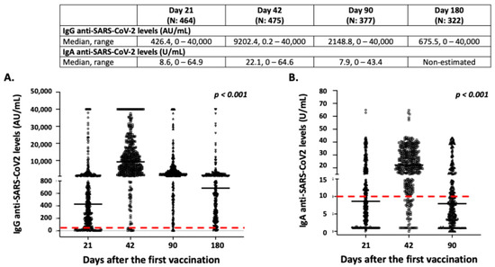 3.3. Intensity and Dynamics of IgG and IgA Responses after BNT162b2 Vaccination