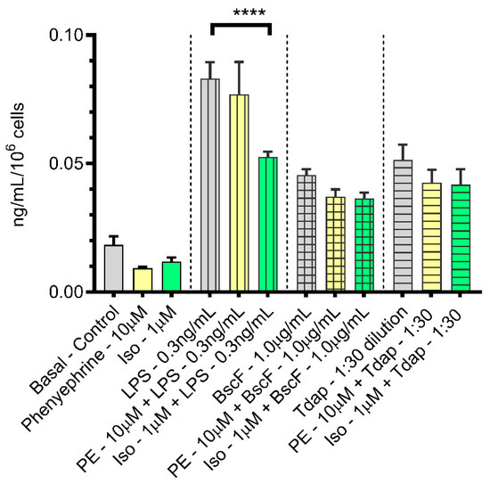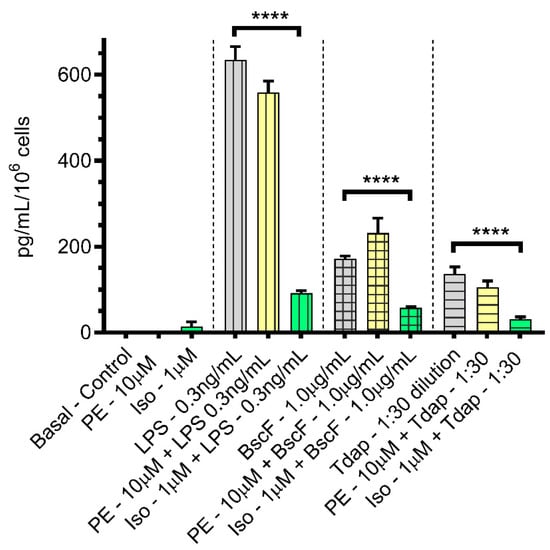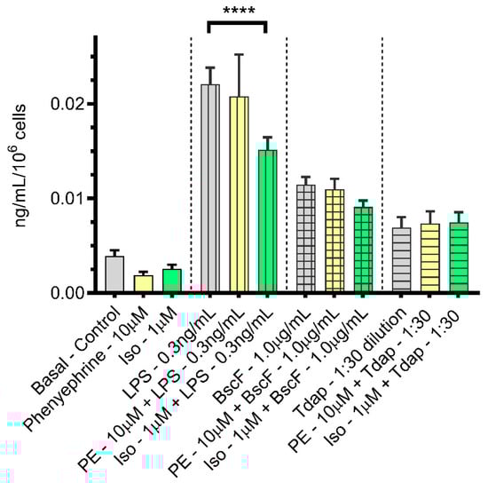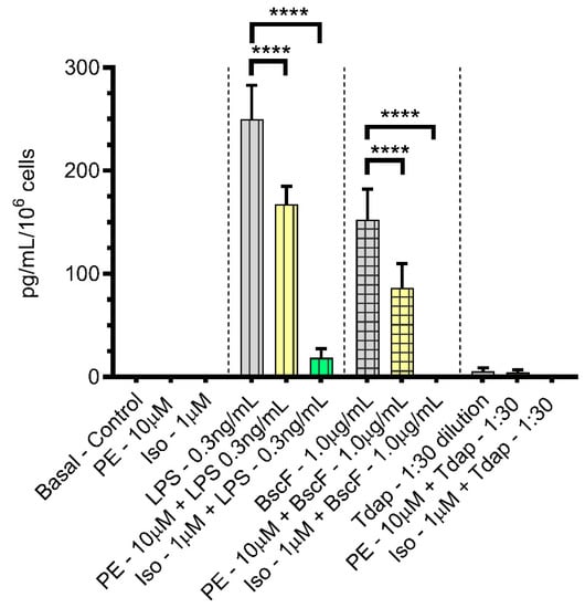 Both PE and ISO reduced the expression of chemokine CXCL10 upregulated by LPS or B. pertussis antigens, BscF and Tdap, in THP-1 cells. THP-1 cells treated with PBS, PE alone (10.0 µM), and ISO alone (1.0 µM) as control treatments, LPS alone (0.3 ng/mL), BscF alone (1.0 µg/mL), and Tdap alone (1:30 dilution) as antigen stimulation and LPS + PE (0.3 ng/mL + 10.0 µM)/LPS + ISO (0.3 ng/mL + 1.0 µM), BscF + PE (1.0 µg/mL + 10.0 µM)/BscF + ISO (1.0 µg/mL + 1.0 µM), and Tdap + PE (1:30 dilution +10.0 µM)/Tdap + ISO (1:30 dilution +1.0 µM) as agonist treatments. Twenty-four hours later, conditioned media from both the control and treatment groups were collected, and chemokine levels were quantitated with FMIA. Data in the bar graph presented as mean ± SEM of triplicate assays. A statistically significant change between control and treatment groups is indicated by **** p < 0.0001.