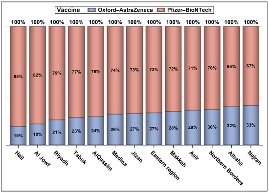 The number of patients who were infected with COVID-19 and were vaccinated between 4 December 2020 and 15 October 2021 was 281,744. Out of the 281,744 vaccinated individuals, 155,466 (55.18%) were vaccinated following recovery and 126,278 (44.82%) were vaccinated prior to COVID-19 infection. Most of those who were infected post-vaccination (99.57%) had recovered; 432 (0.34%) were deceased, and 109 (0.086%) did not have an update on their status (Figure 1). Most of the patients were from the three main regions in the kingdom (Riyadh, Eastern region, and Makkah; Figure 2). The vast majority of patients were vaccinated with the Pfizer–BioNTech COVID-19 vaccine (74.42%); and 25.58% had received the Oxford–AstraZeneca vaccine (Figure 3). We obtained almost the same percentages for the 13 different regions of the kingdom (Figure 3). Approximately 79% of patients who were infected with COVID-19 prior to vaccination and 69% of those vaccinated before the infection were vaccinated with Pfizer–BioNTech. Approximately 52% of patients were female. Most patients who received the Pfizer–BioNTech vaccine (53.69%) were female, while 53.49% of patients who received the Oxford–AstraZeneca vaccine were male. Approximately 0.16% of patients were admitted to ICUs during the COVID-19 infection with no significant differences between the patients according to the vaccine type (Pfizer–BioNTech vs. Oxford–AstraZeneca). Approximately two-thirds of patients vaccinated with Pfizer–BioNTech received two injections and less than 50% of those vaccinated with Oxford–AstraZeneca received two injections (Table 1). Figure 4 shows that ~47% of the patients were young adults (18–35 years), 37% were middle-aged (36–59 years), and 16% were seniors with the majority (>70%) of them being vaccinated with Pfizer–BioNTech.