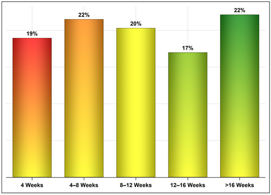 Figure 5 shows the percentages of patients who were infected with COVID-19 after vaccination across different time intervals, and Figure 6 presents the percentages of patients from each age group (young adults, middle-aged, and seniors) who were infected with COVID-19 across different time intervals with no significant difference between the two vaccines. The mean periods from vaccination to infection were 27 and 8 days longer for patients who received one and two doses of the Oxford–AstraZeneca vaccine than for patients who received one and two doses of the Pfizer–BioNTech vaccine, respectively (Figure 7). Even though ~23% of those vaccinated with Oxford–AstraZeneca and admitted to ICUs post-vaccination were deceased in comparison to 18% of those vaccinated with Pfizer–BioNTech, this difference was not significant (Figure 8). Similarly, there were no differences in the LOS between those admitted to ICUs post-vaccination with Oxford–AstraZeneca and those vaccinated with Pfizer–BioNTech (Figure 9). Among those admitted to ICUs, 84 patients (33.33%) received the Oxford–AstraZeneca vaccine, and 168 patients (66.66%) received the Pfizer–BioNTech vaccine. However, 69.84% of those admitted to ICUs had received only one injection of either vaccine (p < 0.0001).