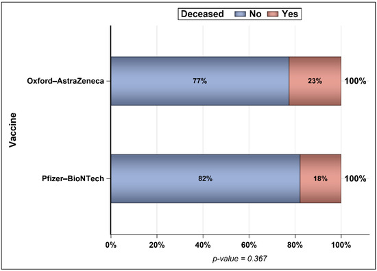 We used descriptive statistics including mean, standard deviation, frequencies, and percentages to present the demographic and vaccination status of COVID-19 patients who were infected and received the vaccine from 4 December 2020 to 15 October 2021. We used basic inferential tests, such as Chi-square, Fisher’s exact test, Student’s t-test, and one-way ANOVA, to compare the percentages and mean of categorical and numerical variables, respectively, for those who received Pfizer–BioNTech or Oxford–AstraZeneca and those who received one to two injections of the vaccines. We conducted multiple logistic regression analyses to examine the relationship between different variables (type of vaccine, number of injections, ICU admission, age, and sex) and survival status (recovered vs. deceased) for patients who were infected after being vaccinated with either vaccine (Pfizer–BioNTech or Oxford–AstraZeneca) and separately for each cohort based on the vaccine type. We presented the results in tables and figures and conducted all statistical analyses using SAS®® version 9.4 (SAS®® Institute, Cary, NC, USA).