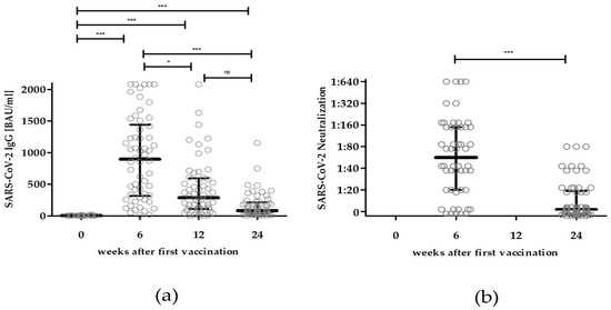 Dynamics of humoral immune responses in patients on hemodialysis after standard vaccination with two injections of 30 µg of BNT162b2. (a) Binding serum antibody titers determined after 0, 6, 12, and 24 weeks after the first vaccination. (b) Neutralizing antibody titers assessed after 6 and 24 weeks after the first vaccination. Circles represent the antibody titers of each subject; black bars represent median antibody titers with their corresponding interquartile ranges. Statistical analysis: Kruskal–Wallis Test followed by Dunn’s multiple comparison test; * = p < 0.05, *** = p < 0.001; ns = non-significant.