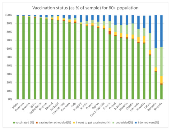 The EU population aged over 60 years intending to be vaccinated was captured using data from the Survey of Health, Ageing and Retirement in Europe (SHARE) (www.share-project.org, accessed on 1 December 2021), wave 8. SHARE is a large, multidisciplinary, cross-national panel survey of micro data on the health, long-term care, socio-economic status and social and family networks of individuals aged 50 years and over. SHARE started in 2004 and was modeled based on the US HRS, whereby respondents are followed regularly after initial contact. Data are internationally comparable; translation consistency is heavily tested and checked across countries and waves [25]. SHARE has design features, such as proxy respondents, adapted for an older population; since wave 7 (2017), it covers 27 EU countries, plus Switzerland and Israel. The collection of data for SHARE wave 8 was interrupted by the pandemic in March 2020; two telephone surveys focusing on the pandemic were conducted using the SHARE panel in June 2020 and July 2021. The latter survey re-interviewed 46,989 respondents aged 50 years and older (91% of whom were 60 years and older) from the first SHARE COVID-19 Survey. It was conducted from June to August 2021 in all 28 countries participating in SHARE (26 EU countries plus Switzerland and Israel). The survey was fielded at a time when vaccine availability for the over-60 population was no longer an issue in any of the participating countries. Thus, SHARE’s second COVID-19 survey remains one of the few large-scale studies, if not the only one, that covers almost all EU countries and has collected data on individuals’ situations during the pandemic, using sampling methodologies that provide internationally comparable data.