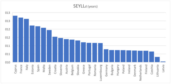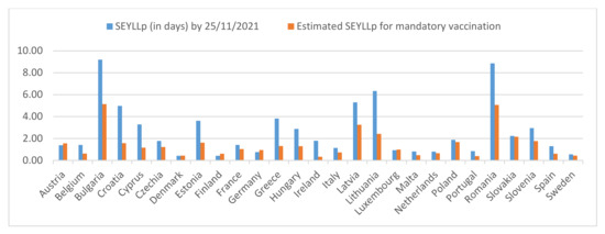 Table 2 illustrates the actual vaccination percentages by 25/11, all of which predated mandatory vaccinations, with the exception of those mentioned in the Introduction, and are hence largely voluntary. The table shows SEYLLd in years and SEYLLp in days from 25 May to 25 November for the 60+ age group in the 27 EU countries. The calculated SEYLLd values (mean = 11.3 years, s.d. = 0.74 years)—shown in Figure 2—are consistent with the results of several relevant studies, where SEYLLd was estimated to be between 10 and 13 years in developed countries [28]. The metric is useful for the purpose of comparison to other causes of death within EU countries, e.g., in most of them, COVID-19 is the third cause of death after cancer and cardiovascular diseases [21]. However, it does not capture the significantly different mortality rates (deaths per million people) between countries. This is obtained with the calculation of SEYLLp.