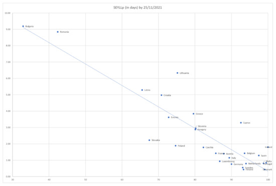 SEYLLp (in days) for the population over 60 in the 27 EU countries from 25 May 2021 to 25 November 2021 vs. their percentage vaccination coverage.