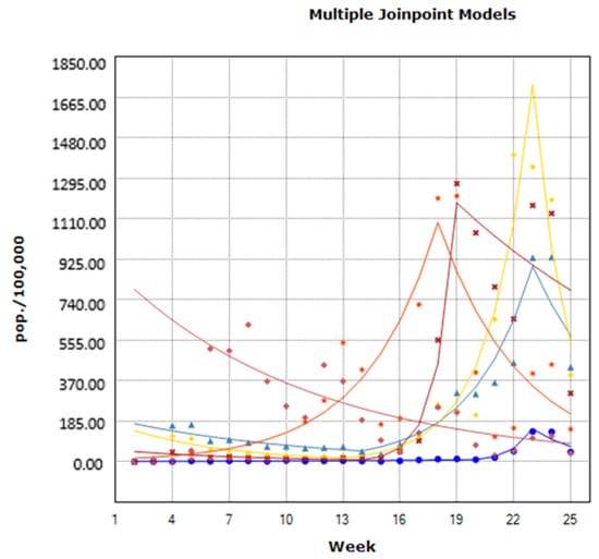 Data are presented as absolute numbers or as percentages. We used joinpoint regression modelling in order to assess the variation in the trends in vaccination rates, SARS-CoV-2 cases, COVID-19-related ICU admissions and COVID-19-related deaths. The joinpoint regression model investigates the combinations of trends that result in a statistically significantly better fit to a data series than a single-trend line fitted using Poisson regression or time-series models [15]. With this procedure, one may determine the number of joinpoints that are sufficient for the estimation of significant alterations in incidence trends over time. The Joinpoint Regression Program (3.5.2) and SPSS 20 were used to analyze the data. A statistically significant joinpoint was set at p < 0.05.