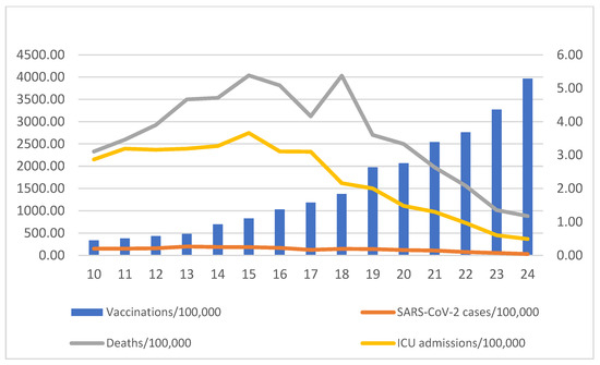The course of vaccinations (per 100,000 population) in relation to weekly average of SARS-CoV-2 cases, COVID-19-related ICU admissions and COVID-19 deaths.