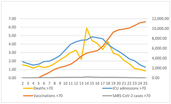 Figure 6 displays the average of vaccinations, weekly COVID-19 cases, ICU admissions and deaths for subjects ≥70 years. For SARS-CoV-2 cases, we observed an increase by 16.23% (Cis: 12.1–20.5, p < 0.05) from week 2 to week 13 while cases decreased significantly by 19.41% (Cis: −23.4–−15.2) from week 14 to week 25. For ICU admissions, we did not observe significant changes from week 2 to week 4, but cases increased significantly by 16.29% (Cis: 13.3–19.4) form week 5 to week 11 and decreased by 14.3% (Cis: −15.8–−12.7, p < 0.05) from week 19 to week 25. From week 12 to week 14 and from week 15 to 18 they remained rather stable. For COVID-19 deaths, we observed a statistical increase by 11.9% (Cis: 8.3–15.6) from week 2 to week 15, followed by a statistically significant decrease by 17.1% (Cis: −22.9–−10.8) from week 16 to week 25. Overall (for the whole study period), in subjects ≥70 we observed a decrease in new SARS-CoV-2 cases by 2.4% (Cis: −5.2–−0.4), a decrease in ICU admissions by 1.2 (Cis: −2.8–−0.4) and a decrease in COVID-19 deaths by 0.5 (Cis: −3.7–−2.8).