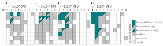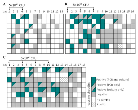 Vaccine shedding in stool after multiple oral vaccinations with ShigETEC. Stool samples were obtained as available from subjects who received (A) two, (B) three or (C) 4 doses of 5 × 1010 CFU ShigETEC and were assessed for the presence of vaccine strain by PCR and culturing. PCR was considered invalid, when two independent 16S rDNA PCR assays yielded negative results and repeated DNA extraction was not possible due to small sample amount. Each line corresponds to one subject.