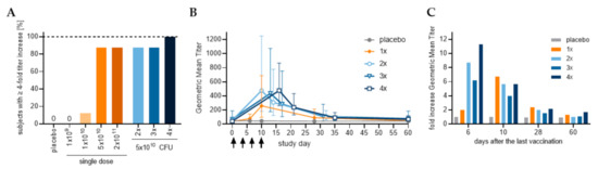 Analysis of vaccine-specific immune responses in serum using ShigETEC lysate as antigen, revealed a robust and strong IgA response (Figure 4A). Even with single immunization with the highest two doses (cohort 1C and 1D) a strong anti-ShigETEC IgA response was observed in most of the vaccinees, with 7 out of 8 vaccinees (87,5%) showing an at least 4-fold titer increase. The number of responders further increased (to 100%) upon multiple immunizations with ShigETEC, and 100% of vaccinees showed at least 4-fold increase in anti-ShigETEC IgA responses after 4 vaccinations. The geometric mean titers were comparable in the 2, 3 and 4-times immunized cohorts and higher than in the 1-time vaccinated group (Figure 4B). However, superiority of the 4-times vaccination schedule was revealed by the comparison of fold increases in anti- ShigETEC IgA geometric mean titer (GMT) values (Figure 4C, Table A1). Analyzing the serum samples for ShigETEC-specific IgG showed much lower levels in terms of titer increases and number of responders, with no vaccinees showing a titer increase of 4-fold or higher. No specific anti-ShigETEC titer increase was detected in placebo recipients.