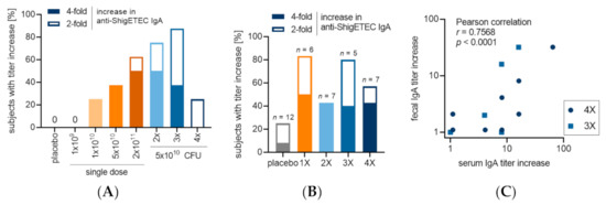 Anti-ShigETEC IgA responses in stool were observed in several subjects in each cohort (Figure 5B). Notably, anti-ShigETEC IgA titer increases correlated between serum and fecal extracts of individuals (Figure 5C), suggesting that serum IgA titers reflect the mucosal response to the vaccine strain.
