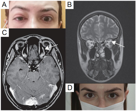 Figure 1. Clinical presentation of the vaccine-induced prothrombotic immune thrombocytopenic disorder (VIPIT) and superior ophthalmic vein (SOV) thrombosis after ChAdOx1 nCoV-19 vaccination. (A) patient presentation at admission with marked proptosis, (B) contrast enhanced magnetic resonance imaging (MRI) revealed SOV thrombosis (white arrow), presented with widening SOV and filling defects, (C) T2 sequence further confirmed SOV thrombosis with the enhanced signal intensity of SOV (white arrow), (D) no symptoms after five days of treatment, published with patient’s permission. Adapted from Panovska-Stavridis, I.; Pivkova-Veljanovska, A.; Trajkova, S.; Lazarevska, M.; Grozdanova, A.; Filipche, V. A Rare Case of Superior Ophthalmic Vein Thrombosis and Thrombocytopenia Following ChAdOx1 nCoV-19 Vaccine Against SARS-CoV-2. Mediterr. J. Hematol. Infect. Dis. 2021, 13, e2021048; Published 1 March 2021. https://doi.org/10.4084/MJHID.2021.048 [20]. Figure 1, Copyright (2021) with permission from Institute of Hematology, Catholic University, Rome, open access article under the terms of the Creative Commons Attribution License.