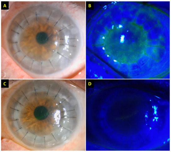 Figure 3. (A,B) Slit-lamp photography demonstrating conjunctival hyperemia, corneal graft haze, diffuse corneal epithelial, and stromal oedema (within the graft), Descemet’s folds, scattered keratic precipitates (KPs), and 1+ cells in anterior chamber. An unusual distribution of fluorescein staining with coarse punctate epitheliopathy over the corneal graft was observed. The central corneal thickness (CCT) was 730 μm. (C,D) At 3-week post treatment, the corneal graft rejection was successfully treated with considerable improvement in the graft transparency, reduction in epithelial and stromal oedema, and resolution of epitheliopathy and anterior chamber inflammation. The best-corrected visual acuity improved to 6/12, with a CCT of 609 μm. Adapted from Rallis, K.I.; Ting, D.S.J.; Said, D.G.; et al. Corneal graft rejection following COVID-19 vaccine. Eye (2021). https://doi.org/10.1038/s41433-021-01671-2 [65]. Figure 1, Copyright (2021) with permission from Nature Publications, open access article under the terms of the Creative Commons Attribution License.
