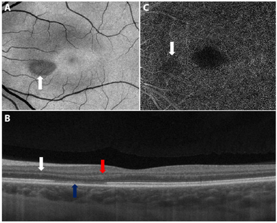 Figure 4. Swept source optical coherence tomography of the left macula. (A) The en face image displays a teardrop-shaped macular lesion (white arrow) nasally to the fovea. (B) The cross-sectional image displays slight hyperreflectivity of the outer nuclear (white arrow) and plexiform (red arrow) layers and disruption of the ellipsoid zone (blue arrow) corresponding to the lesion. (C) The angiogram indicates subtle dropout (white arrow) in the deep capillary plexus corresponding to the lesion. Adapted from Bøhler, A.D.; Strøm, M.E.; Sandvig, K.U.; et al. Acute macular neuroretinopathy following COVID-19 vaccination. Eye (2021). https://doi.org/10.1038/s41433-021-01610-1 [87]. Figure 2, Copyright (2021) with permission from Springer Nature, open access article under the terms of the Creative Commons Attribution License.