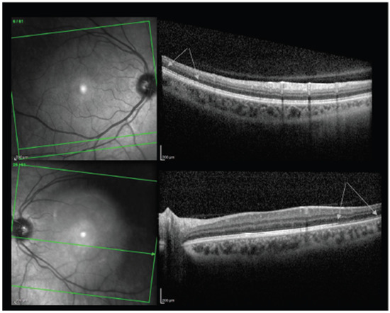 A number of reports suggest that there is an association between vaccination for COVID-19 and development of AMN. Bøhler et al. reported on a 27-year-old female with no past medical history who developed flu-like symptoms followed by a paracentral scotoma OS two days after receiving the AZD1222 vaccine [87]. Examination was notable only for a teardrop-shaped lesion nasal to the fovea. Swept-source OCT revealed slight hyperreflectivity of the outer nuclear and plexiform layers and disruption of the ellipsoid zone (Figure 4). She was diagnosed with unilateral AMN OS. Treatment was not reported. A pair of unilateral AMN cases were likewise reported in women aged 22 and 28 two days following the AZD1222 vaccine by Mambretti et al. [88]. Chen et al. reported a similar case with similar exam findings in a 21-year-old woman who developed paracentral scotomas three days after receiving her first dose of the BNT162b2 vaccine [89].