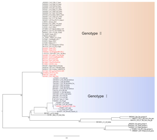 A phylogenetic tree was constructed based on the whole genome sequences of 74 strains in the GenBank database, after which datasets for the sequences were aligned using MAFFT (version 7.149) program [32]. Maximum likelihood (ML) phylogenies for the codon alignment of the genome sequences were estimated using the GTRGAMMA nucleotide substitution model in the IQ-TREE 1.68 software [33]. Node support was determined by nonparametric bootstrapping with 1000 replicates, and the phylogenetic tree was visualized in the Figtree (version 1.4.3) program (http://tree.bio.ed.ac.uk/software/Figtree/) (accessed on 18 January 2022). Types written in red indicate Chinese isolates.