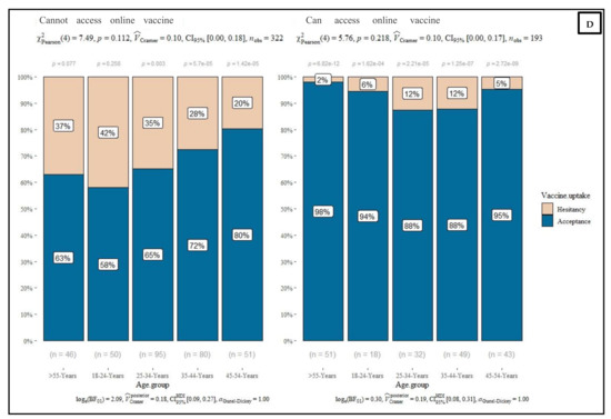 Distribution of COVID-19 vaccine uptake by age groups (A) and, by ethnic groups (B), by level of concern about side effects (C), by ability to access the government online COVID-19 platform (D) and by reported monthly income (E) among respondents from four local communities in South Africa, from the 6th of June to the 30th 2021.