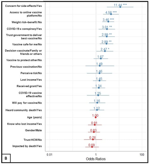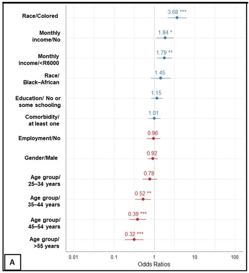 Forest plots displaying factors associated with vaccine hesitance among respondents from four local communities in South Africa, from 6 June to 30 June 2021. Plots (A–C) indicate models adjusted for sociodemographic factors, COVID-19 related factors and combination of (A,B), respectively. Of note, all models are adjusted for gender (binary) and for age (continuous). The vertical line, slightly thicker than the other grid lines (x-axis position 1) indicates the neutral line, i.e., the vertical intercept that indicates no effect. Points in the plots and related horizontal lines represent the estimated odds ratio and their corresponding 95% confidence interval (CI) of COVID-19 vaccine hesitancy defined as uncertainty or intention to refuse COVID-19 vaccination, respectively. Blue and red colors indicate odds of hesitancy and of acceptance respectively. Asterisks indicate the significance level of the p-values (*: p < 0.05, **: p < 0.01, ***: p < 0.001). Exact 95% CI and p-values are provided in Table 2.