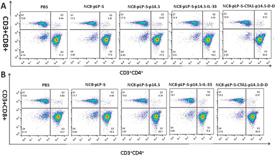Fifty mice were randomly divided into five groups, with ten mice in each group. The mice were orally administered with 200 μL of NC8-pLP-S, NC8-pLP-S-p14.5, NC8-pLP-S-p14.5-IL-33-Mus or NC8-pLP-S-CTA1-p14.5-D-D with 1 × 109 CFU colony-forming units. The control group was given 0.9% normal saline (200 μL) by the same method. The mice were first immunized on the 1st, 2nd and 3rd days, then received booster immunization on the 10th, 11th and 12th days, and finally boosted again on the 21st, 22nd and 23rd days. After the 1st immunization and the 3rd immunization, three mice from each group were randomly selected for flow cytometry analysis. The feces of each mouse were collected for ELISA analysis on the 0, 9th, 19th and 29th days.
