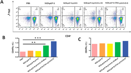 Flow cytometry to detect IFN-γ secretion. (A) Changes in CD4+IFN-γ+ in the spleen; (B) Statistical histogram of CD4+IFN-γ+ changes in spleen; (C) Statistical histogram of CD8+IFN-γ+ changes in spleen. The degree of B cell differentiation in descending order is the CTA1-DD adjuvant group, IL-33 adjuvant group, single antigen group, empty vector group and the control group. ** p < 0.01 and *** p < 0.001 compared with PBS group.