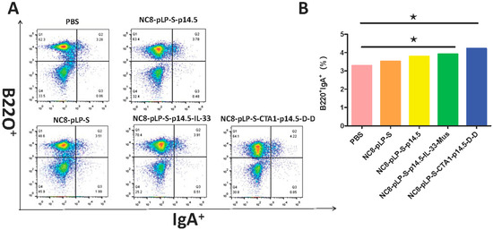 Flow cytometry to detect IgA secretion. (A) Changes in B220+IgA+ in mouse PPs; (B) Statistical histogram of B220+IgA+ changes in mouse PPs. The secretion of B220+IgA+ in descending order is the CTA1-DD adjuvant group, IL-33 adjuvant group, single antigen group, empty vector group and the control group. * p < 0.05 compared with PBS group.