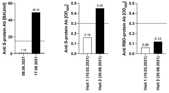 Determination of S- and RBD -specific antibody levels. Y-axes indicate the S- specific BAU/mL levels (left graph, ECLIA, Roche and validated with WHO NIBSC code 20/136) or the OD405-values (middle and right graph) obtained with S- or RBD while x-axes show the respective dates of venipuncture. Dotted lines show the cut-off values of the respective tests l. The two dotted lines represent the different cut-off values of the individual test. The cut-off was set at 15.0 BAU/mL for the visit on 8 June 2021, while it was set as 0.8 BAU/mL for the visit on 17 August 2021.
