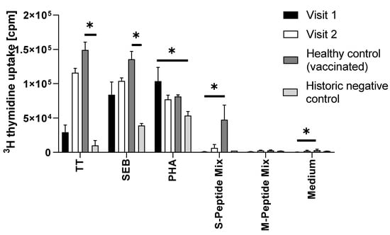Summary of proliferation results (counts per minute, cpm, y-axis) of PBMC that were incubated with the indicated stimuli (x-axis). The bars represent the mean and the whiskers the standard deviation of triplicates. Filled bars show the proliferation of PBMC from the immunocompromised patient obtained at visit 1 (after two shots of Comirnaty). Open bars show the proliferative response of PBMC of the patient at visit two (after two additional shots of Vaxzevria), dark grey bars show the proliferation of PBMC of a vaccinated healthy control subject (two shots of Vaxzevria), and light grey bars the response of PBMC of a historic negative control, sampled before the start of the pandemic. TT, tetanus toxoid; SEB, Staphylococcal enterotoxin B PHA, phytohemagglutinin; S-peptide mix, SARS-CoV-2 spike protein peptide mix; M-peptide-mix, SARS-CoV-2 matrix protein peptide mix. Only significant differences are shown. *, p < 0.05.