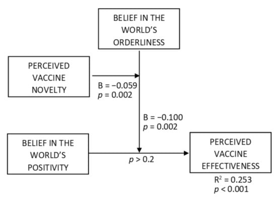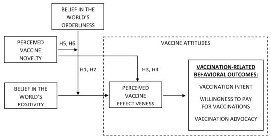As a factor in vaccination attitudes, this paper considers an important kind of optimism, rooted in people’s worldviews. Namely, crucial components of an optimistic worldview are belief in the world’s positivity and the world’s orderliness []. People differ in how strong these two beliefs are [,,]. Our previous study [] suggests that the belief in positivity may increase vaccination intent, but only if the belief in world orderliness is not firm. We speculated that this negative orderliness × positivity interaction effect results from viewing vaccines as standing beyond (outside) the world’s order. If the belief in that order is not firm, belief in the world’s positivity leads to a more positive attitude toward vaccinations. This mechanism was not further examined, but one may suppose that the orderliness × positivity interaction effect depends on perceived vaccine novelty, which is related to viewing vaccines as “intrusive“ and, thus, standing outside the world’s order. Although previous research provides indirect suggestions about the negative influence of perceived vaccine novelty on vaccination intent [,,,], the underlying psychological mechanism remains unexplored. Additionally, it is unknown how beliefs about orderliness and positivity and vaccine novelty shape related vaccine attitudes, such as perceived vaccine effectiveness, willingness to pay for vaccinations, and vaccination advocacy. Therefore, the current research poses the following question: How are various forms of vaccine attitudes (such as vaccination intent, willingness to pay for vaccination, vaccination advocacy, and perceived vaccine effectiveness) shaped by beliefs about the world’s orderliness/positivity and vaccine novelty?