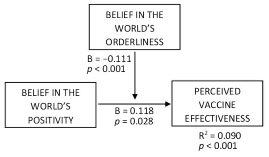 Moderation effects of belief in the world’s orderliness on the relationship between belief in the world’s positivity and perceived vaccine effectiveness.
