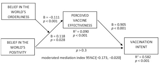 To test H2a, we ran the moderated mediation model with vaccination intent as a dependent variable (Figure 4); the effect of the perceived vaccine effectiveness was positive (B = 0.905, t = 23.975, p < 0.001; R2 = 0.582, p < 0.001), and the moderated mediation index was negative (95% CI [−0.173, −0.020]). The conditional indirect effect of the positivity belief on vaccination intent at the orderliness level of −1SD was positive (95% CI [0.060, 0.393]), while it was non-significant at the mean and +1SD orderliness levels. Those results support H2a.