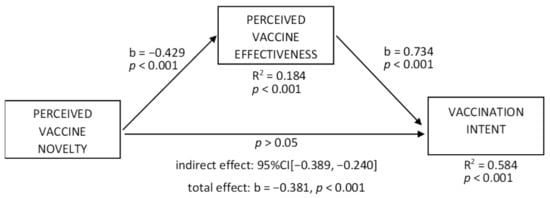 To test H3 and H4a, we ran the mediation model with vaccination intent as a dependent variable (Figure 5); the effect of perceived vaccine novelty on perceived vaccine effectiveness was negative (b = −0.429, t = 9.74, p < 0.001; R2 = 0.584, p < 0.001), supporting H3. Novelty had a negative total effect on vaccination intent (b = −0.381, t = 8.469, p < 0.001); perceived vaccine effectiveness showed a positive effect on vaccination intent (b = 0.734, t = 21.126, p < 0.001), and the indirect effect of novelty was negative (95% CI [−0.389, −0.240]), supporting H4a. Moreover, the direct effect was non-significant, suggesting full mediation.