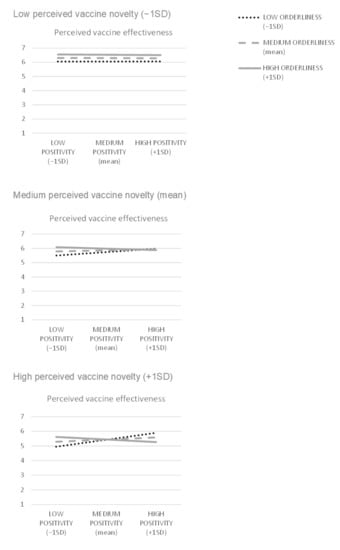 To further examine the mechanism of the negative orderliness × positivity interaction effect, we aim to conceptualize consumer perception of vaccines as standing beyond (outside) the world’s order. As discussed above, this perception may represent a case of incongruity between products (vaccines) and a mental schema of broader life domains such as human health, medicine, and illnesses. To this end, we refer to the concept of product novelty, which is widely used in consumer behavior literature. Novel products are defined as those whose attributes were changed based on modifications in technology []. Novelty may be related to the entire product category (e.g., []). In the case of vaccines, some consumers may perceive them as more novel, which may depend on various factors, such as health knowledge, orientation toward traditions and science, or education.