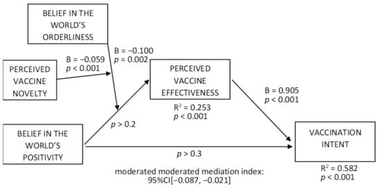 To test H6a, we ran the moderated moderated mediation model with vaccination intent as a dependent variable (Figure 8); the effect of perceived vaccine effectiveness was positive (B = 0.905, t = 23.975, p < 0.001; R2 = 0.582, p < 0.001), and the moderated moderated mediation index was negative (95% CI [−0.087, −0.021]). The conditional indices of moderated mediation (orderliness as a moderator) were negative at the mean and +1SD levels of perceived vaccine novelty (95% CI [−0.162, −0.016], 95% CI [−0.267, −0.080], respectively) while being non-significant at the −1SD novelty level. Among the conditional indirect effects of positivity on vaccination intent at −1SD, mean, and +1SD levels of orderliness and novelty, the positive effects occurred for the −1SD orderliness level combined with the mean and +1SD levels of novelty (for mean novelty: 95% CI [0.005, 0.311]; for +1SD novelty: 95% CI [0.132, 0.505]) while being non-significant for other levels of the moderators. These results support H6a.