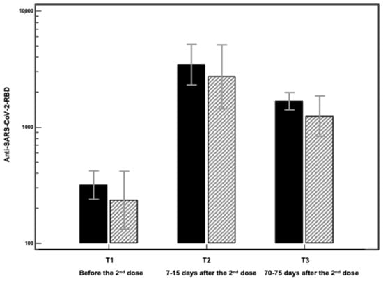 A venous blood sample was collected in Vacutainer tubes 21 days after the first dose and just before the second dose of the vaccine (T1), 7–15 days after the second dose of the vaccine (T2), and 70–75 days after the second and before the third dose of the vaccine (T3). The blood was centrifuged 10 min after collection at 400× g for 10 min at room temperature to isolate serum. Serum samples were then aliquoted and stored at −80 °C until the assays were performed. Antibodies were measured in serum by an anti-SARS-CoV-2-RBD IgG assay (Abbott SARS-CoV-2 IgG II Quant); it quantifies IgG antibodies against the receptor-binding domain (RBD) of the S1 subunit of the spike protein of SARS-CoV-2 by a chemiluminescent microparticle immune assay. The linear range is between 21.0 and 40,000 arbitrary units/mL (AU/mL) and according to the manufacturer, the clinical sensitivity was 98.81% (95% CI 93.56–99.94%) in samples collected ≥15 days after the positive PCR and the clinical specificity 99.55% (95% CI 99.15–99.76%), at a cutoff value 50 AU/mL []. Anti-SARS-CoV-2 RBD IgG assays have shown an excellent correlation with neutralizing antibodies []. The assay is based on chemiluminescent microparticle immune assay (CLIA) []. The correlation coefficient in weighted linear regression of WHO standard with the Abbott anti-RBD is 0.999, and transformation of Abbott anti-RBD AU/mL to WHO binding antibody units (BAU)/mL is feasible using the equation BAU/mL = 0.142 × AU/mL [].