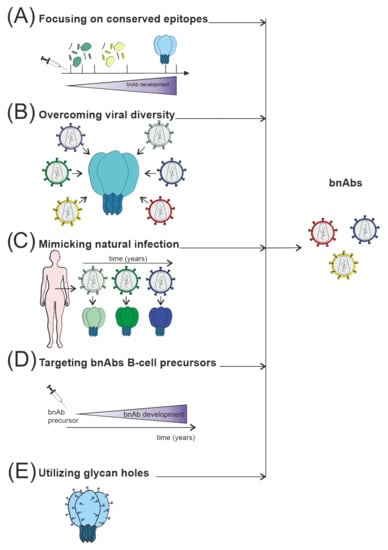 Several strategies are currently used to stimulate nAb responses towards bnAb generation, which consist of (A) directing of Ab response to conserved sites, for example, using fusion peptides; (B) use of mosaic or consensus antigens to overcome the viral diversity of circulating HIV-1 worldwide; (C) clonal immunogens resembling the evolution of the virus in HIV-1 infected individuals modeling natural infection; (D) targeting immunogens to putative bnAb germline progenitors, followed by immunization leading to the affinity maturation pathway to bnAb developm€; (E) selective removing of glycans to focus Ab responses to a specific site of interest, such as CD4 binding site immunogens.