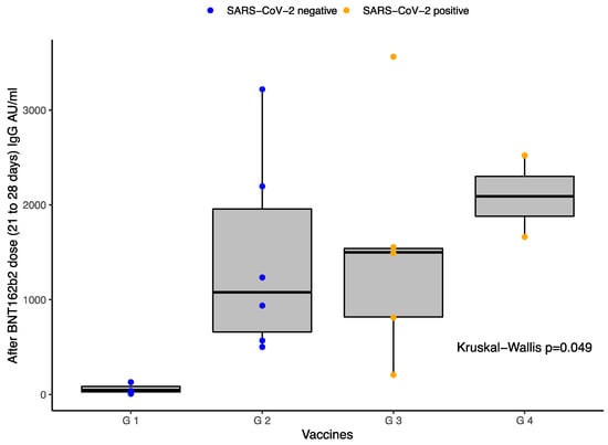 The boxplot in Figure 1 represents the IgG antibodies titers between the four different groups 21–28 days after BNT162b2 dose (about 4 months after first dose of Ad5-nCoV): G1 patients vaccinated with Ad5-nCoV with no known history of SARS-CoV-2 infection, G2 patients vaccinated with Ad5-nCoV and the first dose of BNT162b2 with no known history of SARS-CoV-2 infection, G3 patients vaccinated with Ad5-nCoV with a known history of SARS-CoV-2 infection, and G4 patients vaccinated with Ad5-nCoV and the first dose of BNT162b2 with a known history of SARS-CoV-2 infection. The boxplot shows the 25th, 50th, and 75th percentiles of antibody levels. The Kruskal–Wallis test was applied for comparisons showing a p-value = 0.049. The image shows statistical differences between all groups. Volunteers exposed to BNT162b2 after Ad5-nCoV have higher levels of IgG S1/S2 than those that did not receive the boost. Additionally, patients previously exposed to SARS-CoV-2 infection had higher antibody titers. The highest level of antibody levels was G4. Blue dots represent negative history of SARS-CoV-2 infection. Yellow dots represent positive history of SARS-CoV-2 infection.