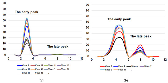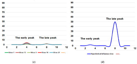 Four possible combinations of toxicity and pathogenicity of influenza virus for mice. Virus 1—A/California/07/2009; virus 2—A/Bolivia/559/2013; virus 3—A/Mississippi/10/2013; virus 4—A/New Hampshire/04/2013; virus 5—A/South Africa/3626/2013; virus 6—A/Florida/62/2014; virus 7—A/Laos/1187/2014; virus 8—A/New York/61/2015; virus 9—A/Slovenia/2903/2015; virus 10—A/Bangladesh/3002/2015; virus 11—A/Newcastle/67/2017; virus 12—A/South Australia/272/2017; virus 13—A/New Jersey/13/2018; virus 14—A/Darwin/123/2018; virus 15—A/Brisbane/02/2018; virus 16—A/lowa/59/2018; virus 17—A/lowa/12/2019; virus 18—A/Victoria/2570/2019; virus 19—A/Guangdong-Maonan/SWL1536/2019; virus 20—A/Arkansas/08/2020; virus 21—A/Indiana/02/2020. X-axis—days post-infection. Y-axis—lethality, %. (a) the virus is toxic but not pathogenic for mice; (b) the virus is toxic and pathogenic for mice; (c) the virus is non-toxic and non-pathogenic for mice; (d) the virus is non-toxic but pathogenic for mice. The fourth variant is possible only theoretically. So far, we have not encountered strains with a similar combination of features. As for the other three variants, all the viruses studied were distributed as follows. Group (iii) includes five viruses: A/California/7/2009, A/Slovenia/2903/2015, A/New Jersey/13/2018, A/Darwin/123/2018, and A/Indiana/02/20. Group (ii) included six viruses: A/South Africa/3626/2013, A/Bolivia/559/2013, A/New Hampshire/04/2013, A/Laos/1187/2014, A/Florida/62/2014 and A/Bangladesh/3002/2015 and the first group (i) which has most of the viruses (consisted of ten viruses): A/Mississippi/10/2013, A/New York/61/2015, A/South Australia/272/2017, A/Newcastle/67/2017, A/Iowa/59/2018, A/Brisbane/02/2018, A/Victoria/2570/2019, A/Guangdong-Maonan/SWL1536/2019, A/Iowa/12/2019 and A/Arkansas/08/2020.