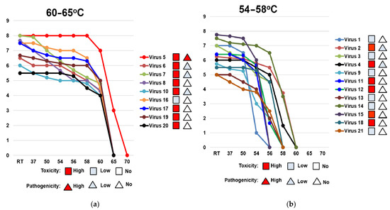 Comparison of the dynamic of losses of thermal stability of the hemagglutinin of A(H1N1)pdm09 viruses circulating in 2009–2020. HA activity temperature threshold is (a) 60–65 °C (high thermal stability); (b) 54–58 °C (low thermal stability). RT—room temperature. X-axis—temperature (°C). Y-axis—log2 HA titer. Virus 1—A/California/07/2009; virus 2—A/Bolivia/559/2013; virus 3—A/Mississippi/10/2013; virus 4—A/New Hampshire/04/2013; virus 5—A/South Africa/3626/2013; virus 6—A/Florida/62/2014; virus 7—A/Laos/1187/2014; virus 8—A/New York/61/2015; virus 9—A/Slovenia/2903/2015; virus 10—A/Bangladesh/3002/2015; virus 11—A/Newcastle/67/2017; virus 12—A/South Australia/272/2017; virus 13—A/New Jersey/13/2018; virus 14—A/Darwin/123/2018; virus 15—A/Brisbane/02/2018; virus 16—A/lowa/59/2018; virus 17—A/lowa/12/2019; virus 18—A/Victoria/2570/2019; virus 19—A/Guangdong-Maonan/SWL1536/2019; virus 20—A/Arkansas/08/2020; virus 21—A/Indiana/02/2020. The red square indicates a strain of high toxicity. The red triangle indicates strain of high pathogenicity. The pale blue square indicates a strain of low or no toxicity. The pale blue triangle indicates strain of low or no pathogenicity.