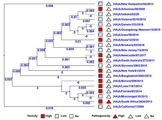The ancestor of all A(H1N1)pdm09 viruses—the A/California/7/2009 strain—was non-toxic and non-pathogenic for mice. Of the 21 viruses, 11 (52.4%) were highly toxic, where the toxicity results of these viruses were as follows: virus 2, A/Bolivia/559/2013 was 100%; virus 5, A/South Africa/3626/2013 was 80%; virus 6, A/Florida/62/2014 was 80%; virus 7, A/Laos/1187/2014 was 100%; virus 8, A/New York/61/2015 was 60%; virus 10, A/Bangladesh/3002/2015 was 100%; virus 11, A/Newcastle/67/2017 was 80%; virus 12, A/South Australia/272/2017 was 90%; virus 17, A/lowa/12/2019 was 100%; virus 19, A/Guangdong-Maonan/SWL1536/2019 was 90%; and virus 20, A/Arkansas/08/2020 was 80%. Besides this, 10 (47.6%) were non-toxic or slightly toxic (Table 3).