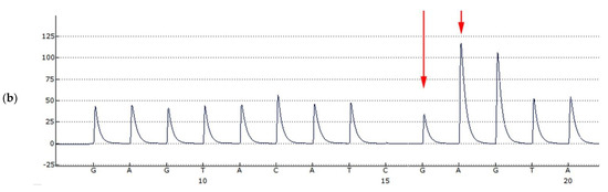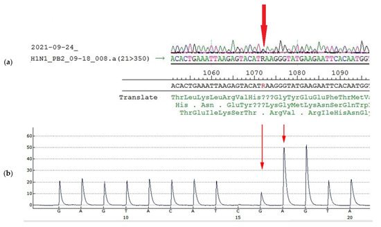 Sanger sequencing and pyrosequencing of A/South Africa/3626/2013 virus of mice isolates (a): Sanger sequencing of PB2 gene fragment, (b): Detection of the nucleotide sequence in PB2 fragment 1064–1079 by pyrosequencing. Arrows show the peaks of interest.