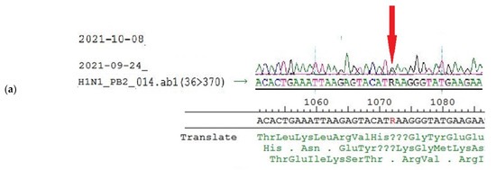 Further investigations into the heterogeneity A/G in 1072 nucleotide position in PB2 gene segment were conducted, including sequencing of viral RNA extracted from mice lung tissue on the third day after the infection (E4 + one passage in mice). Sanger sequencing and pyrosequencing of virus population isolated from mice lungs revealed the persistence of 1072 A/G heterogeneity (Figure 7a,b).