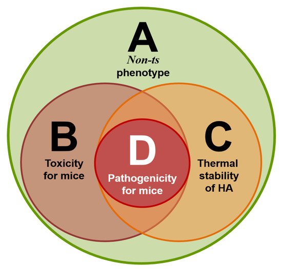 Our research concluded that for a virus to have properties such as toxicity, or the thermal stability of the hemagglutinin, it is necessary but not sufficient to be characterized as a non-ts phenotype. In other words, if the virus has a toxic effect or thermally stable hemagglutinin, it is adequate evidence that the virus has a non-ts phenotype but it is not the other way around. Furthermore, having a non-ts phenotype, toxicity and thermally stable hemagglutinin are necessary but not sufficient for the virus to become pathogenic for laboratory animals, indicating that there are still some properties that might also contribute to the degree of pathogenicity. The strongest candidates are the virus transmissibility and resistance to sera non-specific inhibitors. However, if the virus is pathogenic for laboratory animals, that means that it has all of the other three properties (Figure 8).
