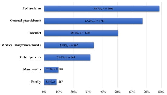 The main source of information on vaccinations, as reported by the respondents, was the pediatrician (78.7%, n = 2006) and/or the general practitioner (GP) (67.2%, n = 1713). However, online information (50.4%, n = 1284) or from other parents (31.6%, n = 805) were often used by respondents (Figure 1).