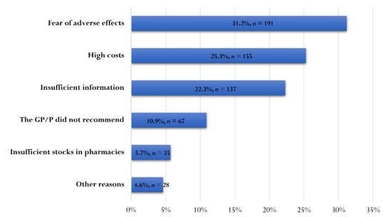 A percentage of 76.0% (n = 1937) of the responding parents stated that they had given at least one optional vaccine to at least one of their children. Among the reasons provided by parents who did not give any optional vaccine (24.0%, n = 613), the fear of possible adverse effects (31.2%, n = 191) ranked first. High costs (25.3%, n = 155) and a lack of clear and sufficient information on optional vaccines (22.3%, n = 137) were also cited by parents as reasons for not vaccinating. A total of 67 parents (10.9%) stated that they did not give any additional vaccines to their children based on the recommendation from their GP/pediatrician (Figure 3).