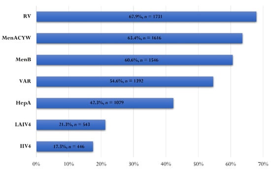 A high percentage of parents (77.6%, n = 1979) believed that OV brings an additional health safety benefit to their children. Therefore, 92.8% (n = 2366) of respondents believed that some of the optional vaccines should be included in the standard, free vaccination schedule. The following vaccines were among the most desired by parents to be included in the NIP: RV (67.9%, n = 1731), MenACYW (63.4%, n = 1616) and MenB (60.6%, n = 1546) (Figure 4).