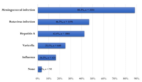 We assessed which diseases preventable by OV are generating significant parental anxiety related to potential infection with the respective strain in their children. Meningococcal infection appeared to cause the greatest fear among parents (88.3%, n = 2251), followed by rotavirus infection (46.7%, n = 1191) and hepatitis A (42.4%, n = 1081) (Figure 5).