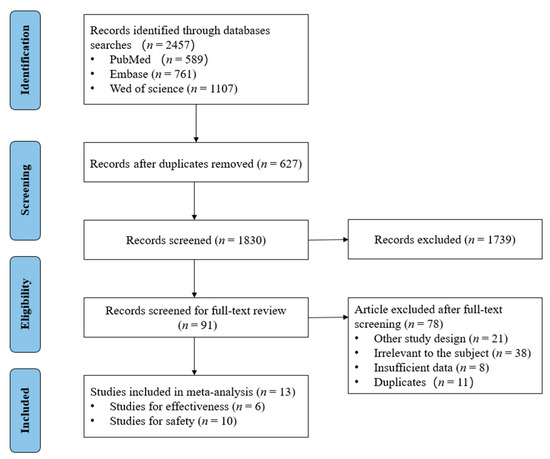 A total of 2457 citations were searched for PubMed, Embase, and Web of Science (Figure 1). Then 627 citations were excluded for duplicates. After the review by titles and abstracts, 91 citations were retained for full-text review. Finally, 13 eligible articles were reserved, including seven RCTs, three cohort studies, and three cross-sectional studies. Six articles were for the effectiveness (Supplementary Table S2) and ten articles were for safety of SARS-CoV-2 vaccines (Supplementary Table S3). Among studies giving an analysis of effectiveness, children and adolescents in four of those studies were from the USA (207,859 participants) and two studies were from multiple countries (3003 participants). Among studies for the analysis of safety, children and adolescents in four of those studies were form the USA (177,622 participants), four studies were from China (2796 participants), one study was from multiple countries (2260 participants), and one study was from Saudi Arabia (965 participants). Participants received the BNT162b2 mRNA COVID-19 vaccine in nine studies, (five studies for Americans, two studies for multinational participants, one study for Chinese, and one study for Saudi Arabian); the mRNA-1273 vaccine in one study for Americans; and the CoronaVac, BBIBP-CorV, and Ad5-vectored COVID-19 vaccines in three studies for Chinese separately. All of the studies had low risk of bias, except for one study with moderate risk of bias (Supplementary Table S4), indicating that their quality was high.