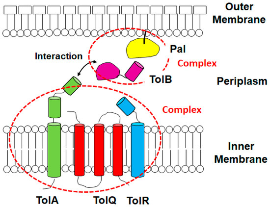 The Tol/Pal system is a set of protein complexes. It is composed of the TolA, TolB, TolQ, TolR, and Pal proteins, and they form two protein complexes that traverse the outer membrane, periplasmic space and inner membrane [4]. Although the tol/pal genes were originally identified in Escherichia coli, these orthologous genes are found in many Gram-negative bacteria [5]. The tol/pal genes are transcribed in two operons (ybgC-tolQ-tolR-tolA and tolB-pal-cpoB), while a single large (ybgC-tolQ-tolR-tolA-tolB-pal-cpoB) transcript is also observed [6,7]. Expression of tol/pal genes is regulated by RcsC, a sensor kinase of the two-component regulatory system, in E. coli, iron in Pseudomonas aeruginosa and CRP (cyclic AMP receptor protein) in Klebsiella pneumoniae [8,9,10]. The TolQ, TolR and TolA proteins form a complex in the inner membrane while the periplasmic TolB protein interacts with the Pal protein anchored in the outer membrane [11,12] (Figure 1). The TolQ-TolR-TolA inner membrane complex has structural similarities to the TonB-ExbB-ExbD iron/siderophore uptake system and the MotA-MotB flagellar motor complex [13,14]. Some in vitro studies show that TolB binds to the C-terminal domain of the TolA protein [15,16,17]. TolB can also interact with several proteins localized in the outer membrane, including OmpA, OmpF, and Lpp [18]. The function of the Tol/Pal system is disrupted when any of the tolA, tolB, tolQ, tolR and pal genes are mutated. The ybgC and cpoB (formally named ybgF) genes encode cytoplasmic lipid thioesterase and the periplasmic regulator of peptidoglycan peptide crosslinking, respectively [19,20]. Neither YbgC nor CpoB participates in the Tol/Pal system because these mutations do not yield the same phenotypes as tol/pal mutants. Mutations in the tol/pal genes have a pleiotropic effect [21]. The tol/pal genes were originally characterized as genes associated with tolerance to colicins that are bacteriocins produced by E. coli [22]. The tol/pal mutants were shown to be resistant to colicins with a low ability of colicin uptake, resulting in the cells escaping death. The following studies showed that mutations in tol/pal genes disturb the outer membrane integrity, induce the formation of mucoid colonies with increased production of colonic acid, and decrease the translocation of filamentous bacteriophages into the cytoplasm [4,8,23,24,25,26]. Remarkably, the disturbance of the outer membrane barrier leads to increased susceptibility to some antimicrobial agents, including colistin, β-lactams, vancomycin and novobiocin [27,28,29,30]. The tol/pal genes are also involved in the process of bacterial cell division and morphology, and inactivation of these genes induces filamentation of cells in several bacteria, such as E. coli, Pseudomonas putida, Vibrio cholerae [31,32,33].