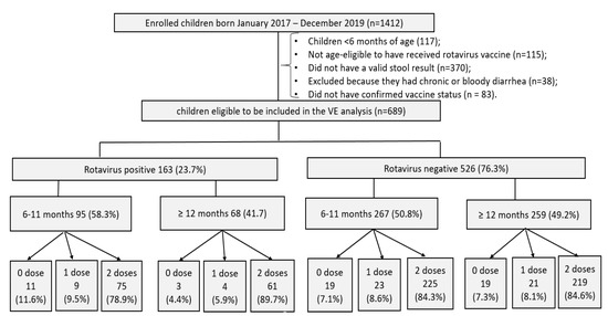 From January 2017 through December 2019, about 1412 children with acute diarrhoea were enrolled in the two surveillance systems. A total of 689 (48.8%) children aged between 6 and 59 months hospitalized with AGE met the inclusion criteria for VE analysis, with the majority from urban hospitals (84.5%; 582/689) and 15.5% (107/689) from a rural hospital. Overall, 23.7% (163/689) of children were positive for rotavirus (cases), and 76.3% (526/689) were negative (controls) (Figure 1).